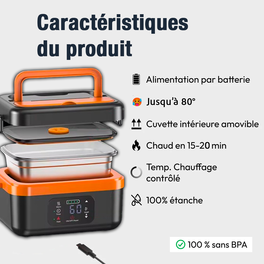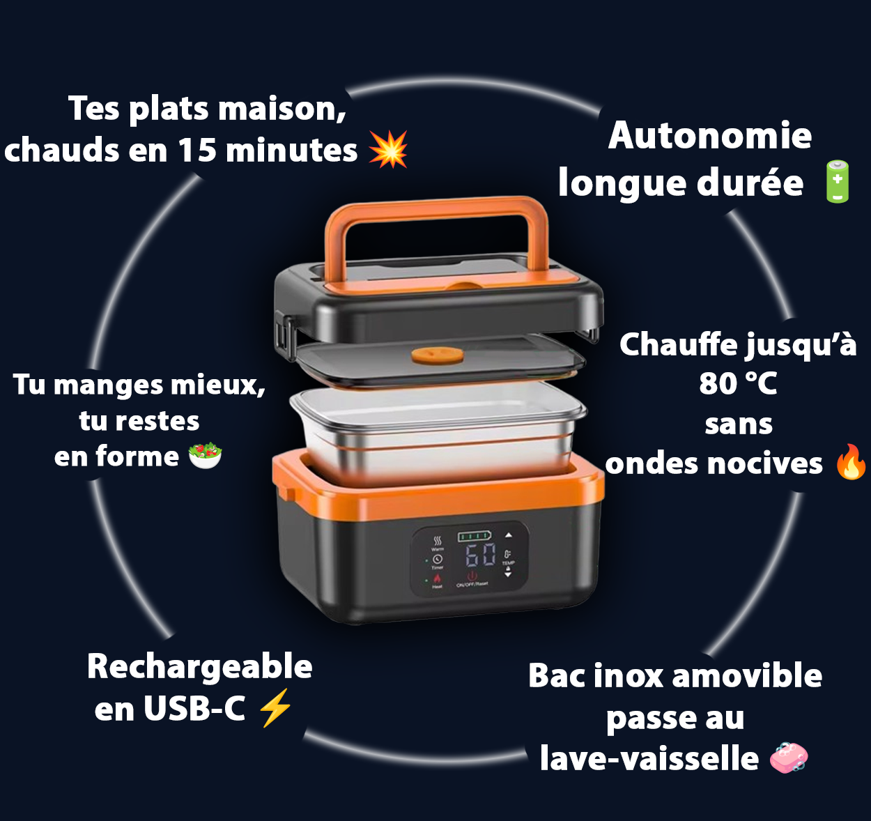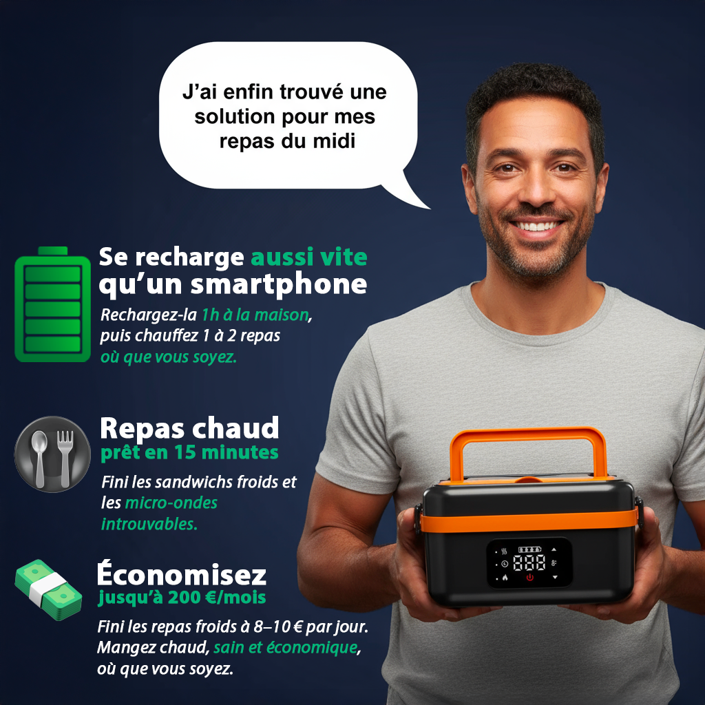 Il suffit de la recharger 1 heure à la maison, comme un smartphone, et vous pouvez ensuite chauffer 1 à 2 repas où que vous soyez — au travail, dans votre camion, ou sur le chantier.