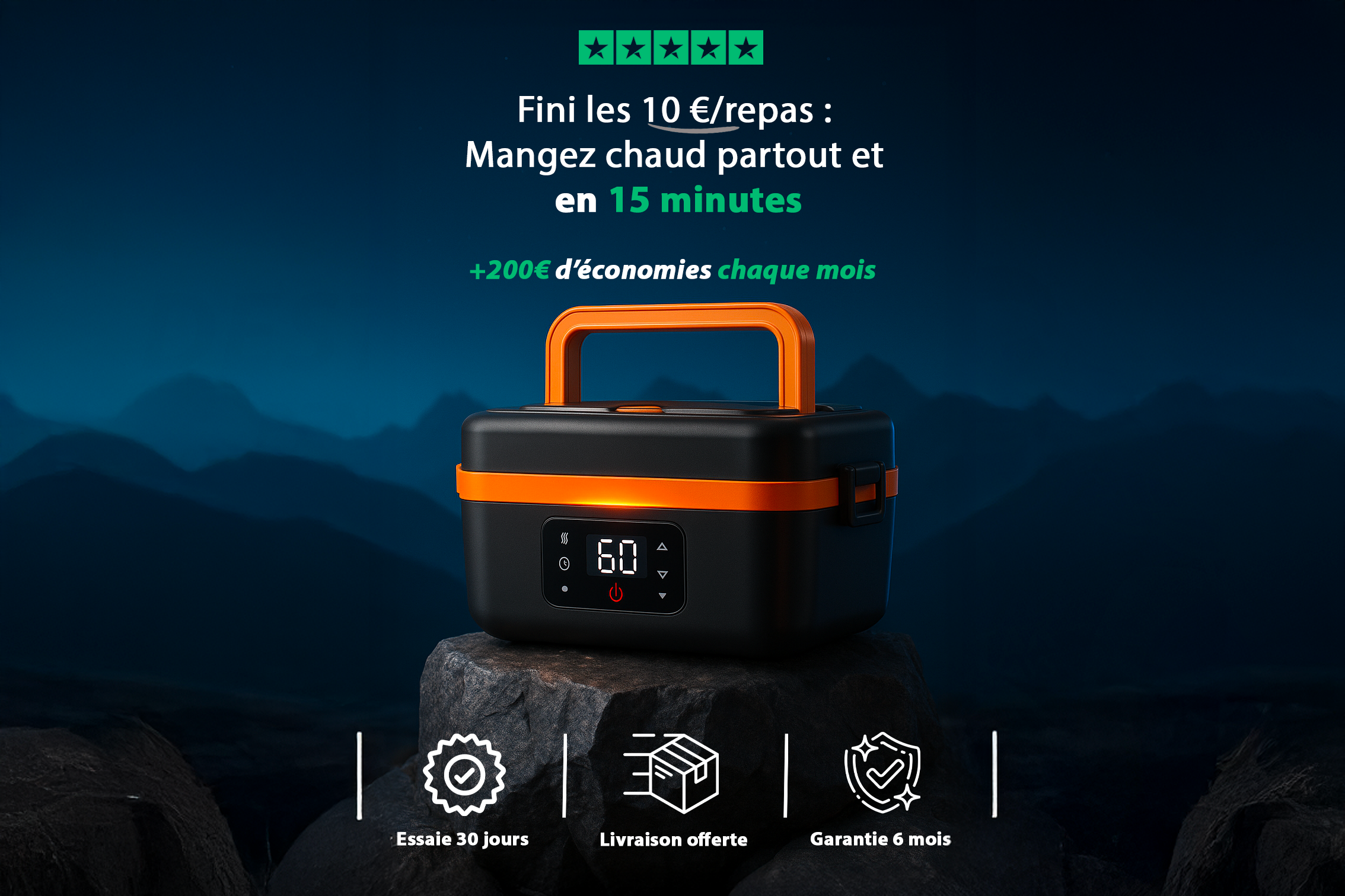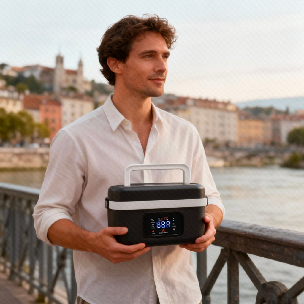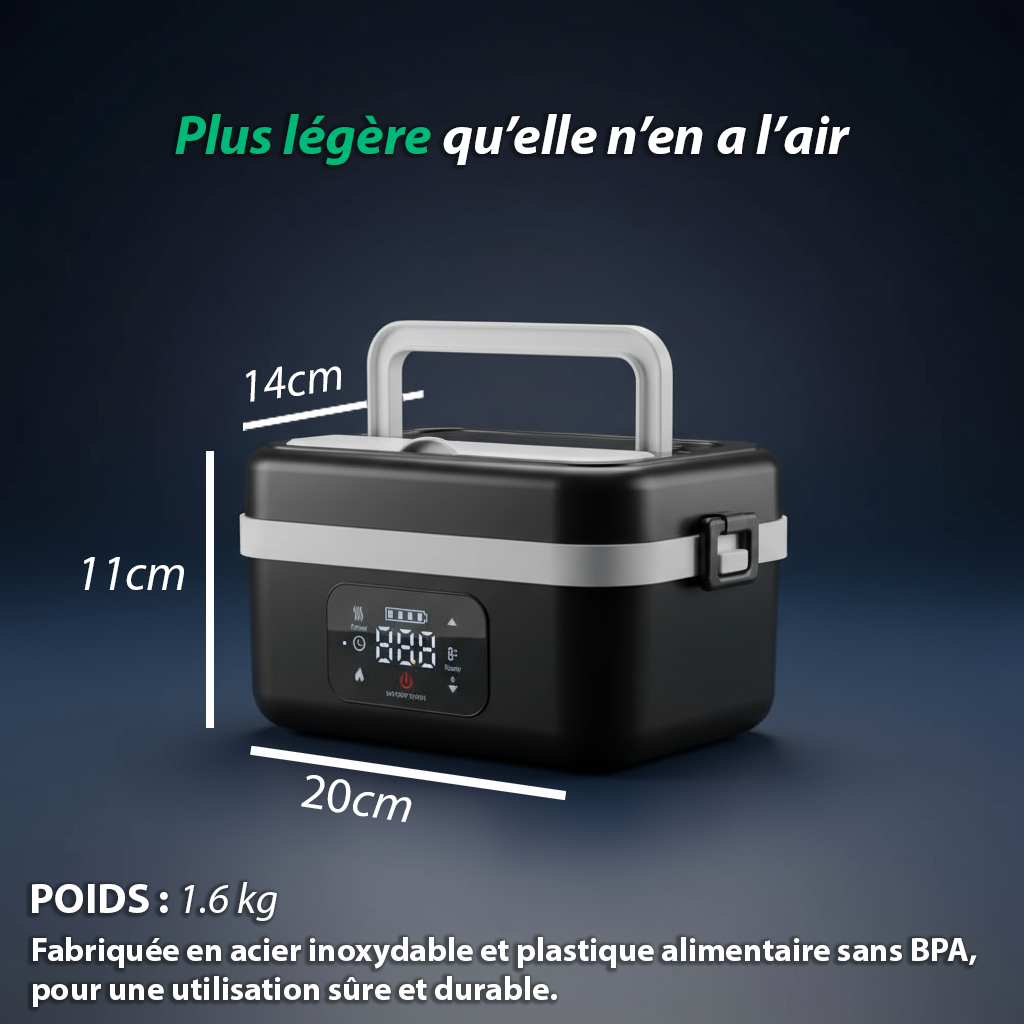 Il suffit de la recharger 1 heure à la maison, comme un smartphone, et vous pouvez ensuite chauffer 1 à 2 repas où que vous soyez — au travail, dans votre camion, ou sur le chantier.