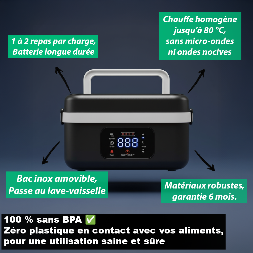 Ensuite, vous pouvez chauffer 1 à 2 repas n’importe où, sans prise, sans micro-ondes, et sans aucune onde nocive.